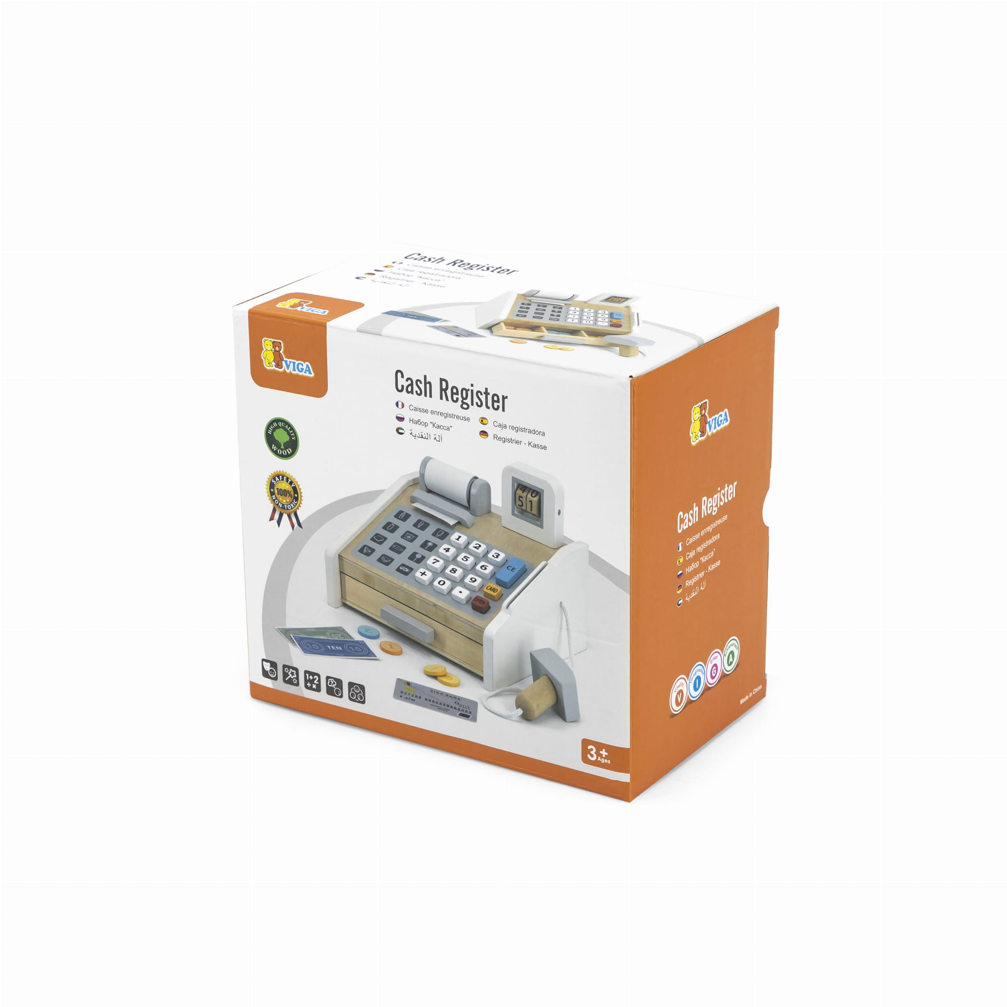 Zestaw zawiera kasę z przyciskami, terminal płatniczy, pieniążki oraz papierowe akcesoria do zabawy. Jest idealnym uzupełnieniem drewnianej kuchni, lodziarni czy mini sklepiku.