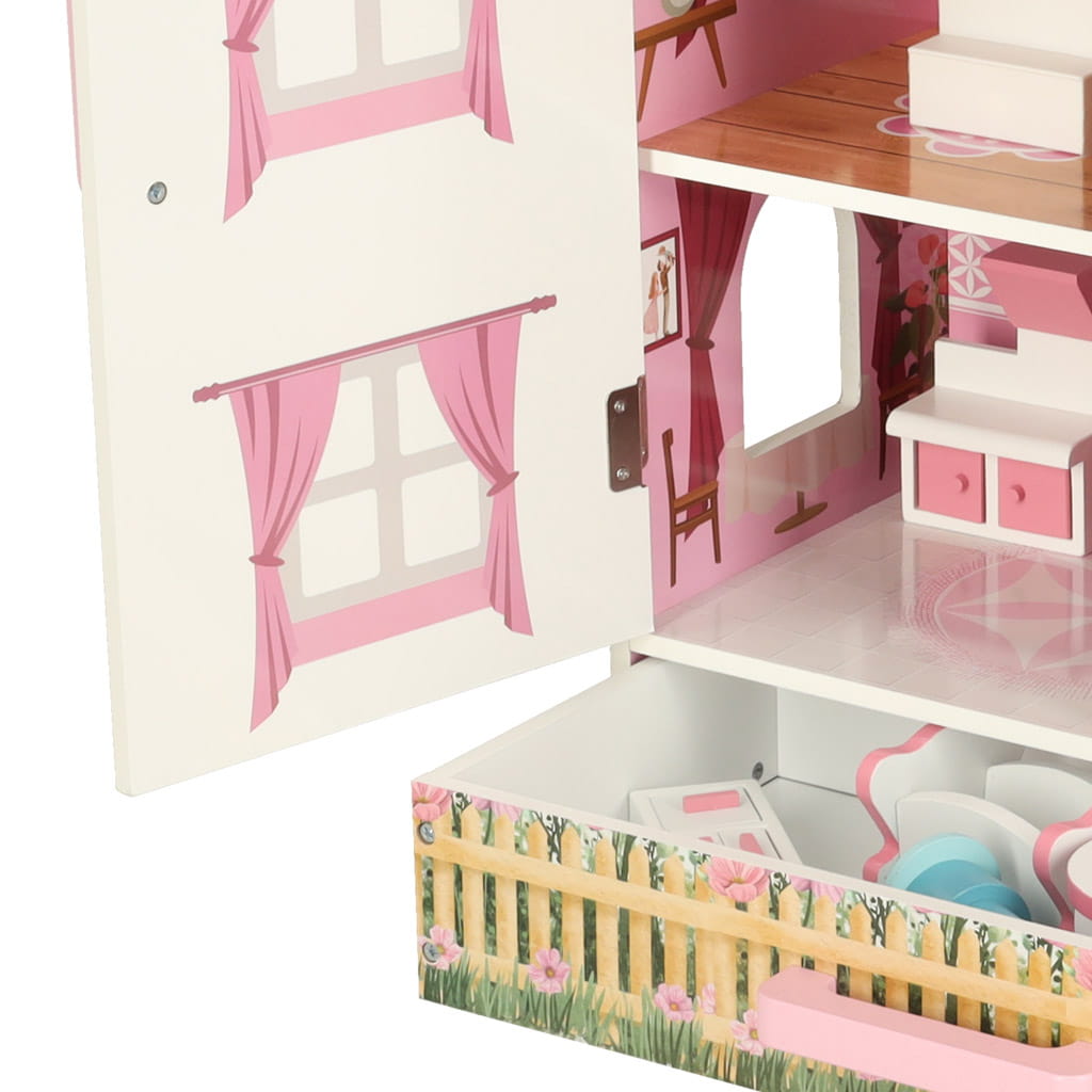 Drewniany domek dla lalek zamykany z szufladą na skarby wysoki 80 cm – różowy domek z mebelkami Prezent dla dziewczynki 3+