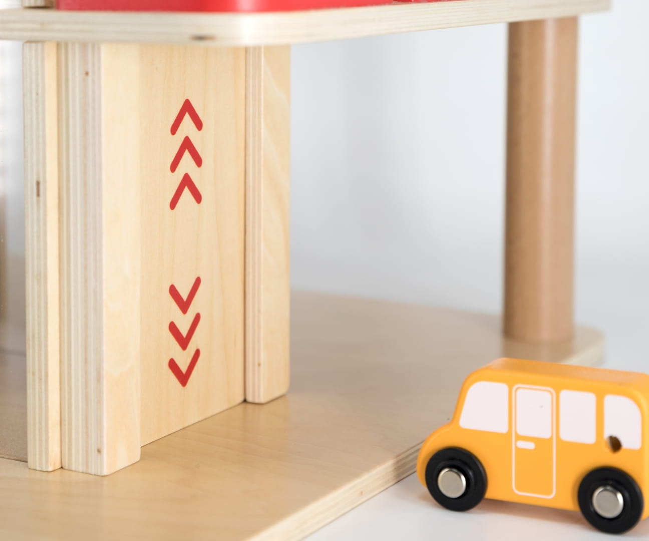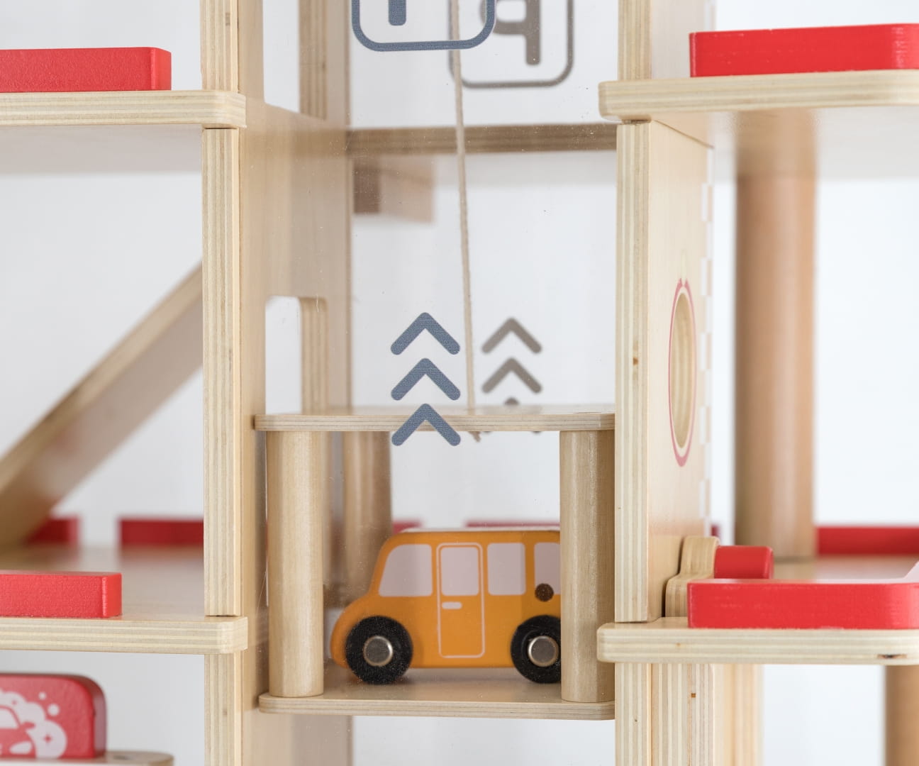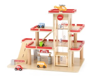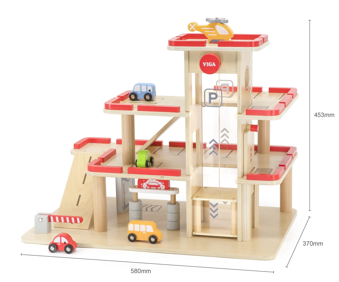 Drewniany garaż miejski parking z windą i helikopterem dla dzieci zabawka