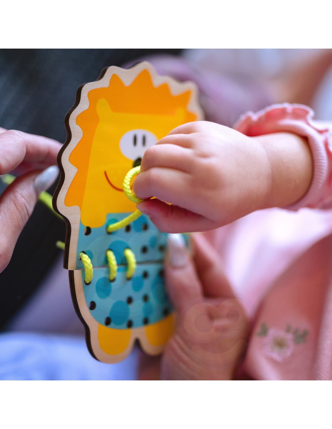 Drewniana sznurowanka – ćwiczy motorykę małą, cierpliwość i precyzję dłoni.