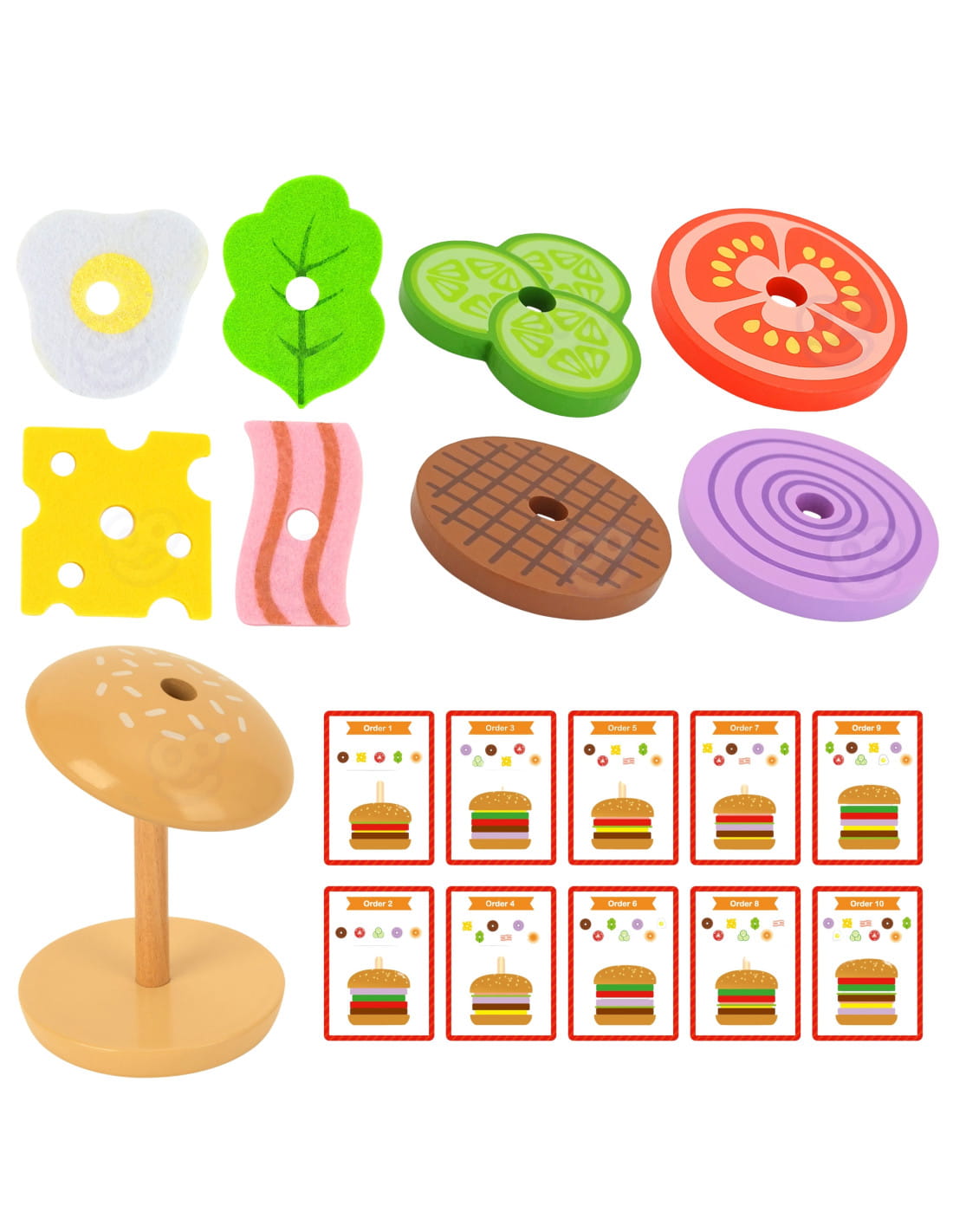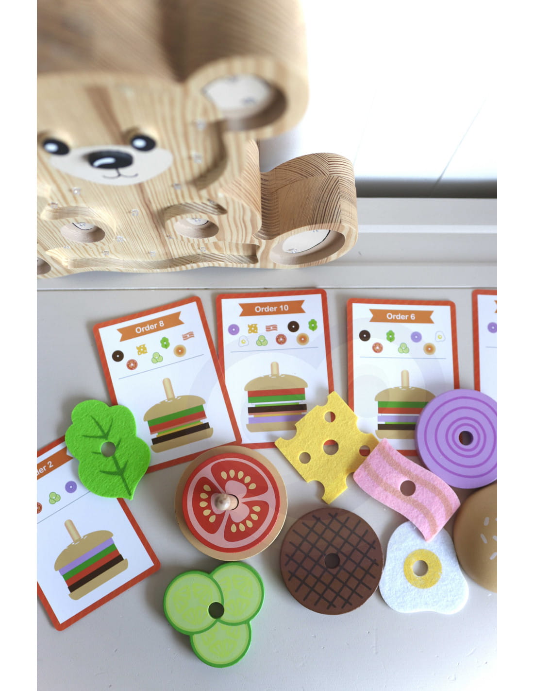 W zestawie: drewniana sznurowanka, układanka wg wzorów, grube klocki magnetyczne i burger do układania – wszystko, czego maluch potrzebuje, by uczyć się przez zabawę.