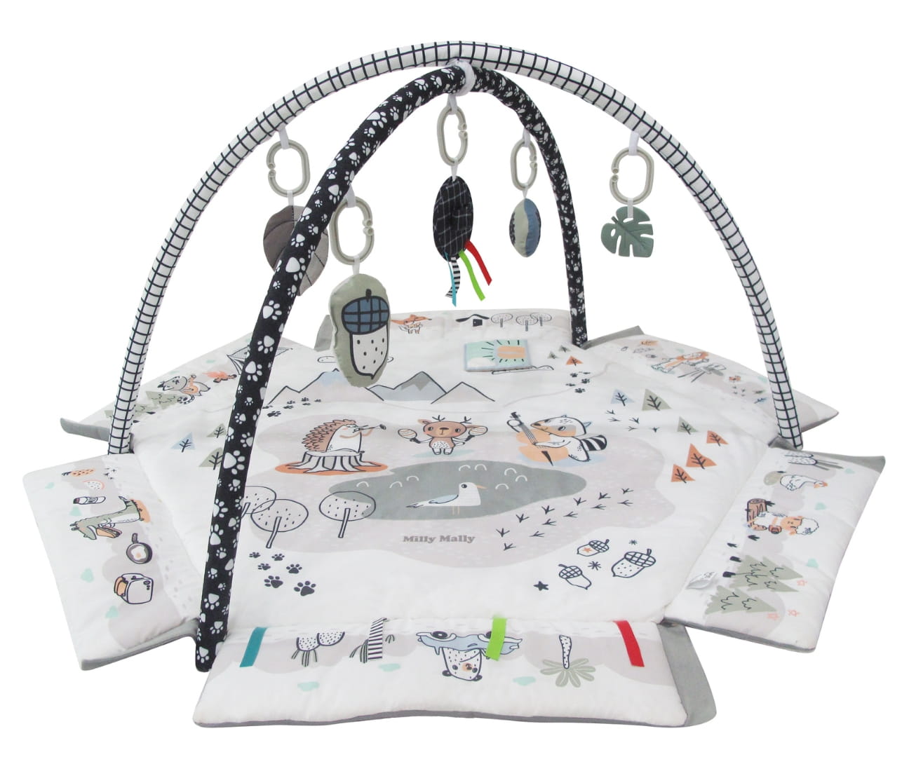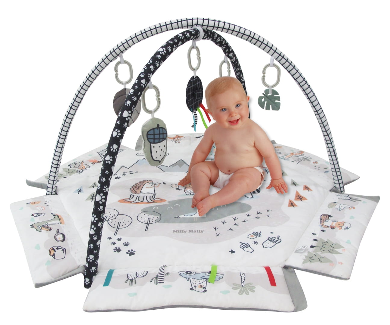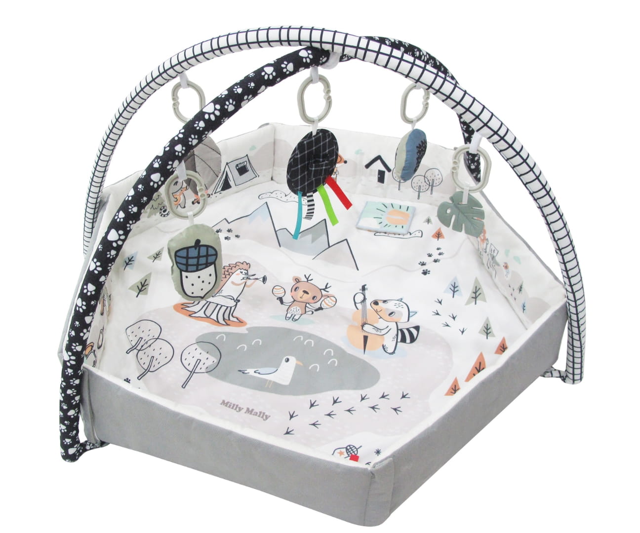 Rozłożone częściowo boki i pałąki – idealne dla maluszków które już się turlają i zaczynają raczkować. Natomiast 2 pałąki z pozawieszanymi sensorycznymi zabawkami uatrakcyjnią zabawę z dzieckiem.