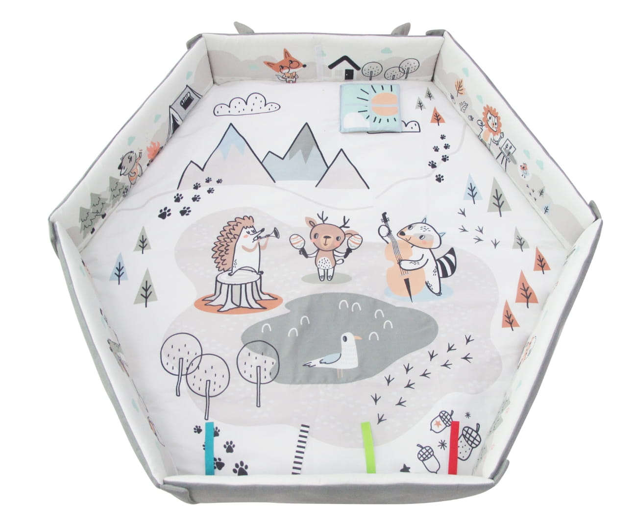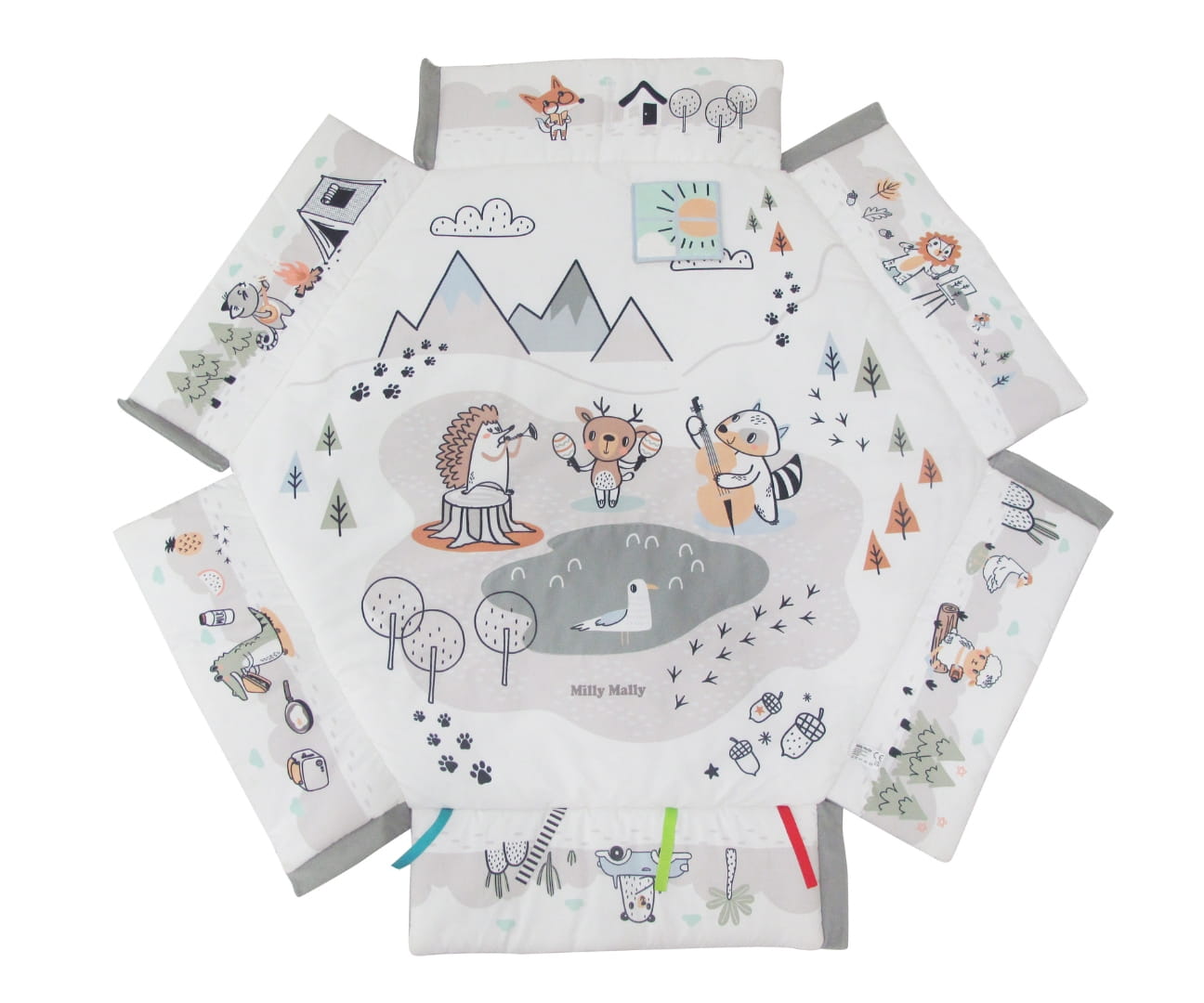 Wielofunkcyjna mata niemowlęca z miękkiego materiału Minky, która łączy w sobie 5 różnych funkcji rozwijających. Wyposażona w kolorowe elementy sensoryczne, bezpieczne zabawki i różnorodne tekstury, które stymulują rozwój maluszka. Idealna od pierwszych dni życia do momentu, gdy dziecko zacznie raczkować.
