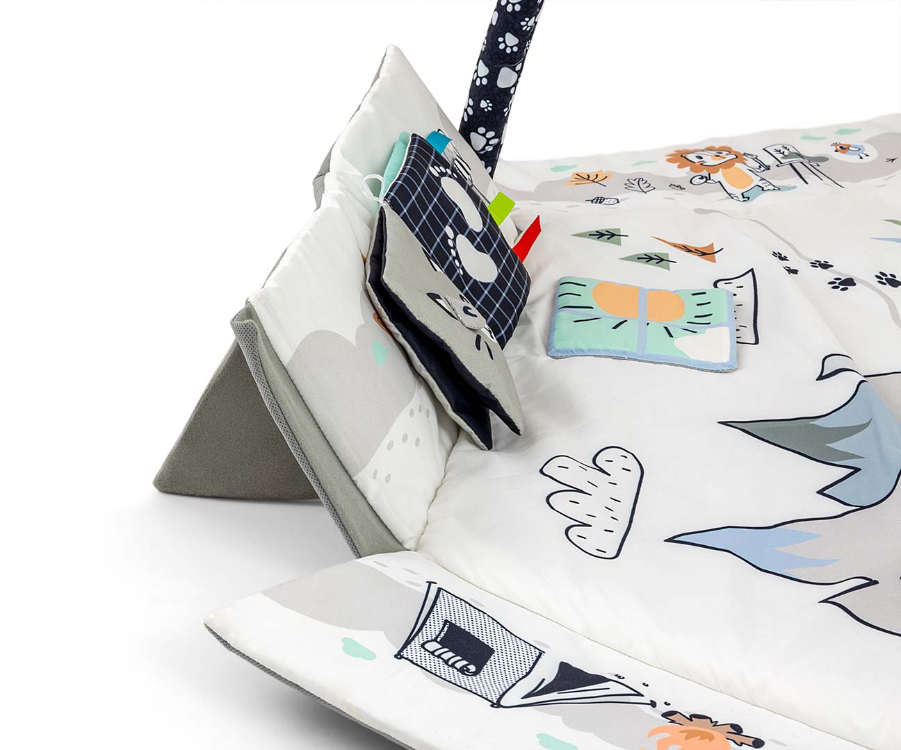 Złożone boki idealne dla najmłodszych dzieci zapewniają bezpieczną przestrzeń do zabawy lub snu. Pałąki mocowane są na zewnątrz maty za pomocą dodatkowych zaczepów umieszczonych w jej spodzie.