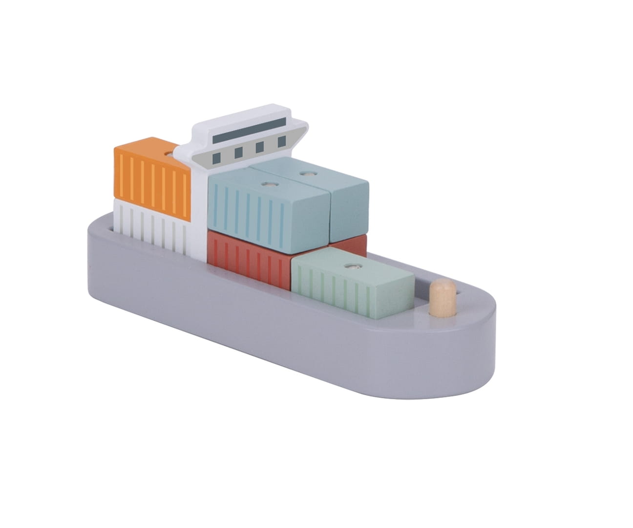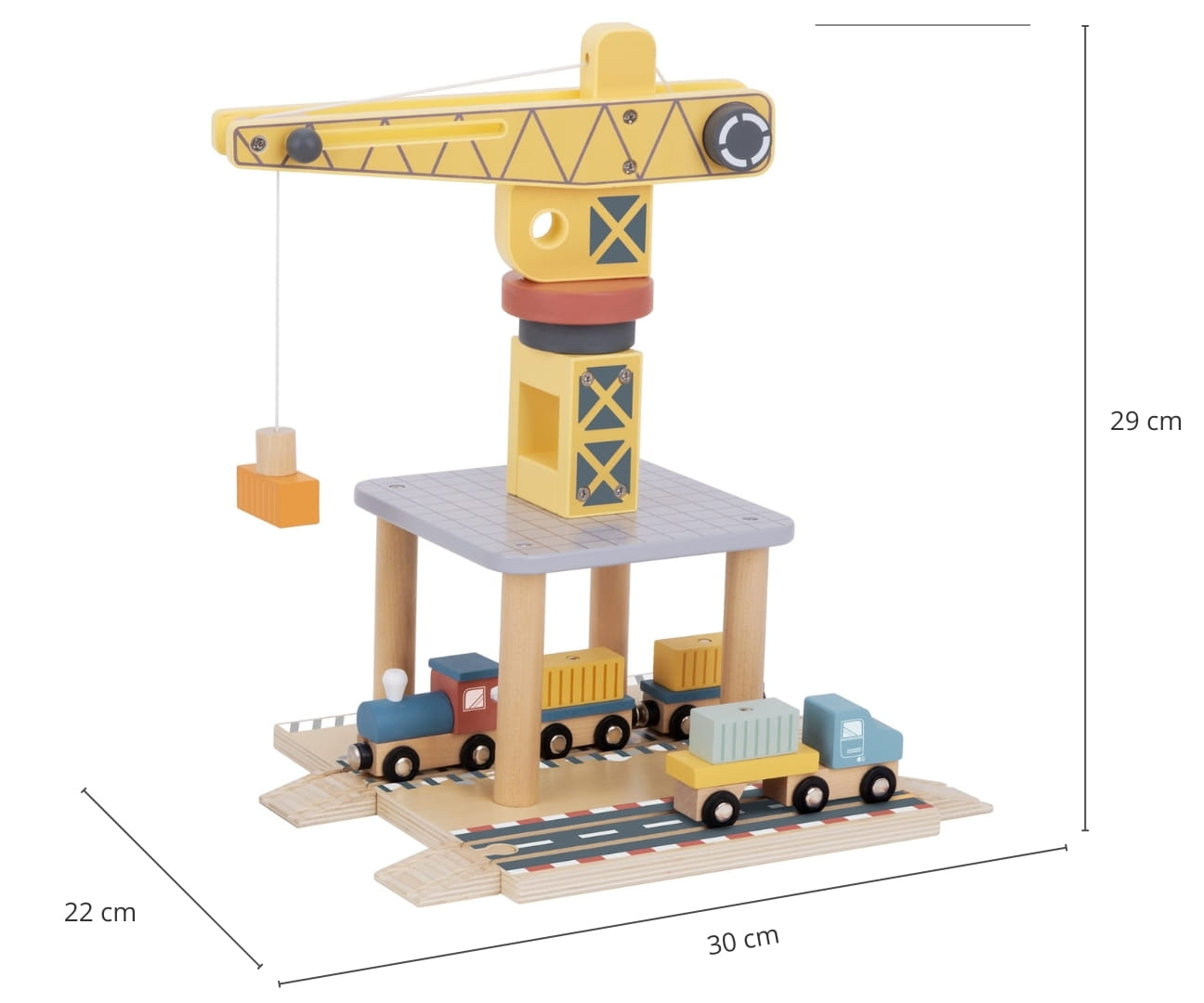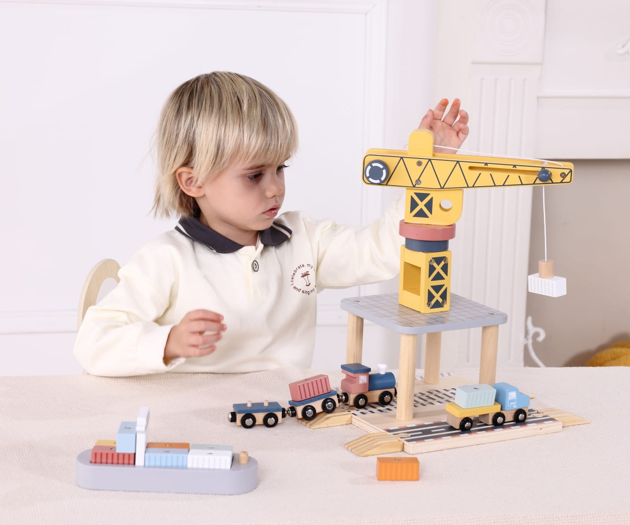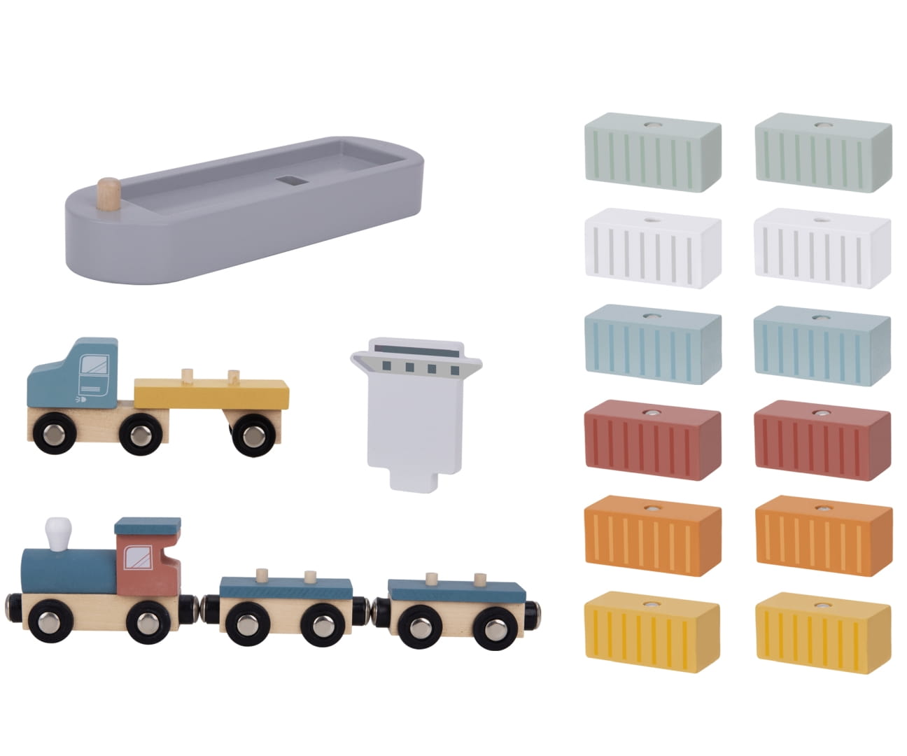 W komplecie dziecko znajdzie m.in. duży żuraw portowy, statek, ciężarówkę, lokomotywę z wagonikami, kontenery oraz platformę załadunkową. Wszystkie elementy wykonane są z wysokiej jakości drewna i pomalowane bezpiecznymi farbami, odpowiednimi dla najmłodszych.