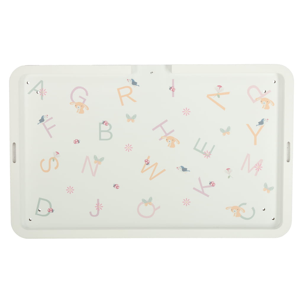 Dzięki różnorodnym elementom manipulacyjnym, takim jak suwaki, ruchome kostki, zębatki, sorter z trzema kształtami, cymbałki z pałeczką, a także labirynty z kolorowymi koralikami maluchy poznają świat poprzez zabawę. Wierzchni blat (47,5 x 29,5 cm) można zdjąć, przekształcając stolik w miejsce do nauki pisania czy malowania. Stolik 2w1 to nie tylko edukacyjny mebel, ale także wyjątkowa ozdoba dziecięcego pokoju – pastelowe kolory i urocze rysunki tworzą przytulną atmosferę, zachęcając do kreatywnej zabawy. Stolik ma optymalną wysokość, dzięki czemu jest idealnie dopasowany do potrzeb najmłodszych.