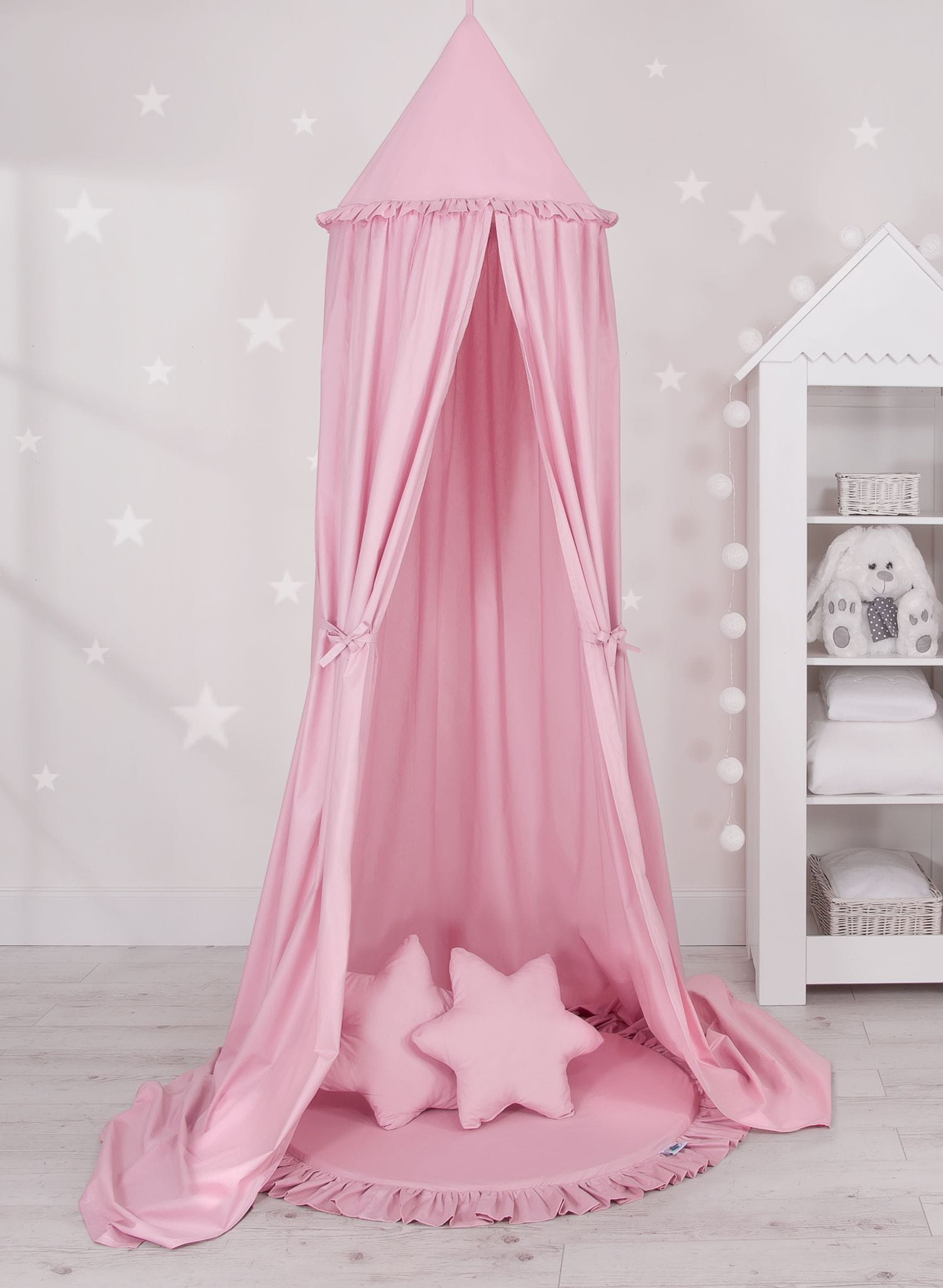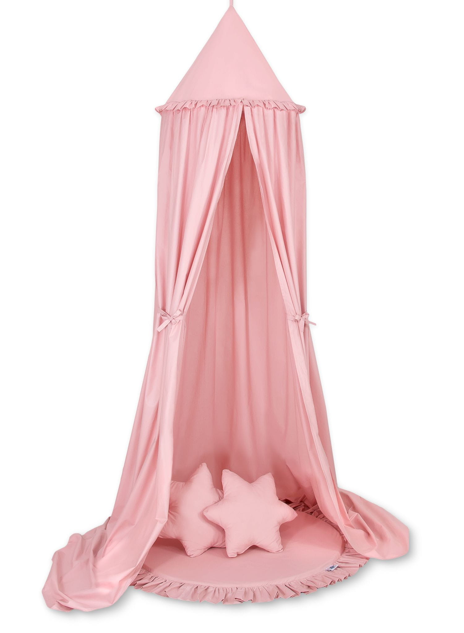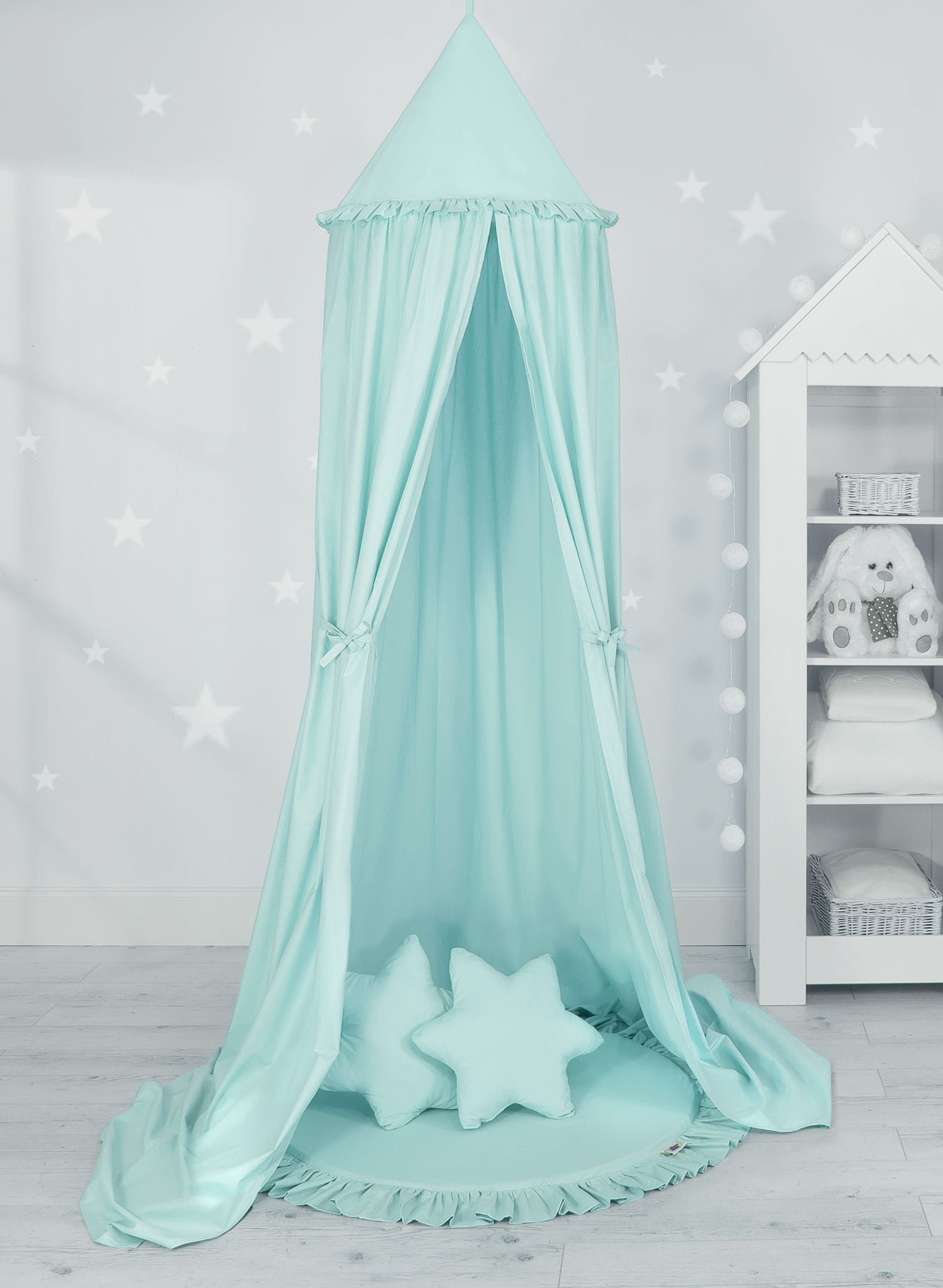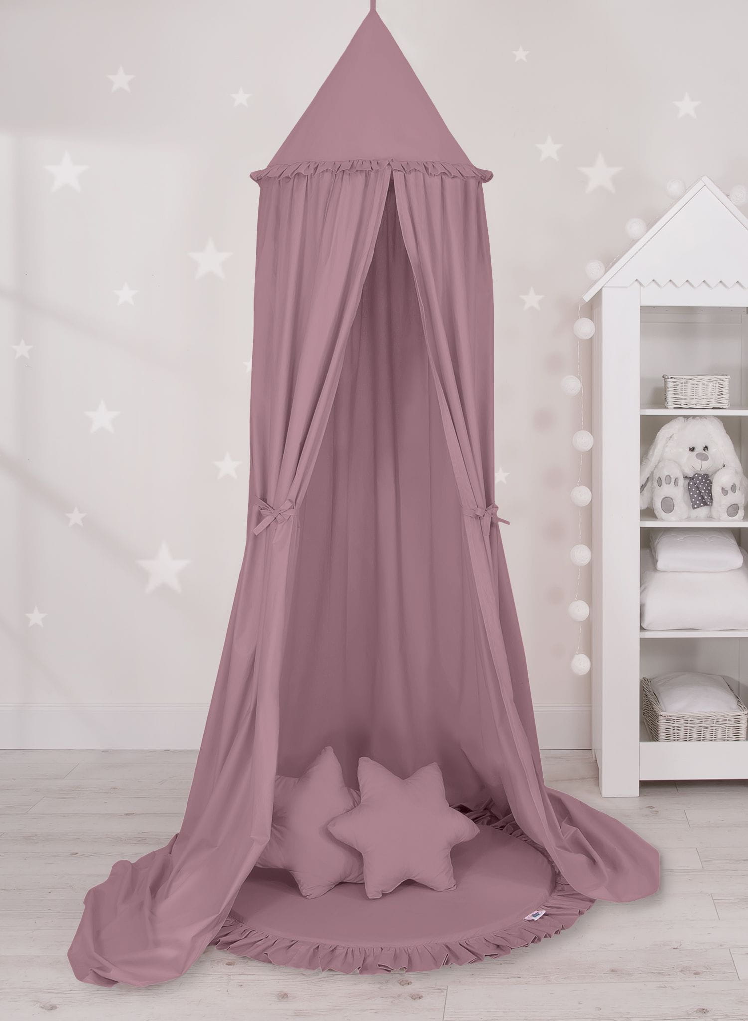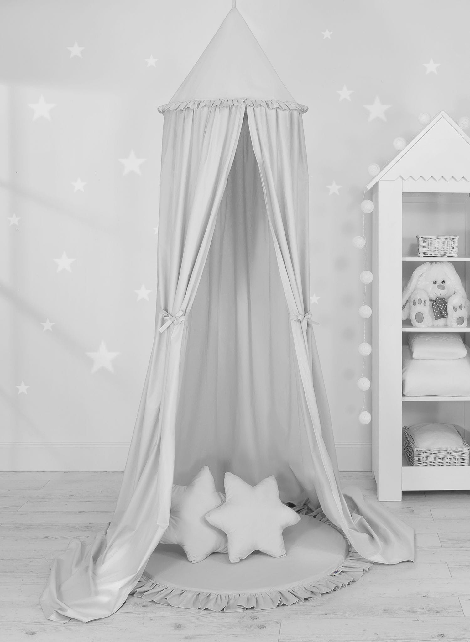 Stylowy zestaw do pokoju dziecięcego: baldachim wiszący, mata z falbanką i poduszki to idealne rozwiązanie do stworzenia przytulnej strefy zabawy i odpoczynku. Delikatny design, miękkie materiały i funkcjonalność, którą pokochają dzieci i mamy.