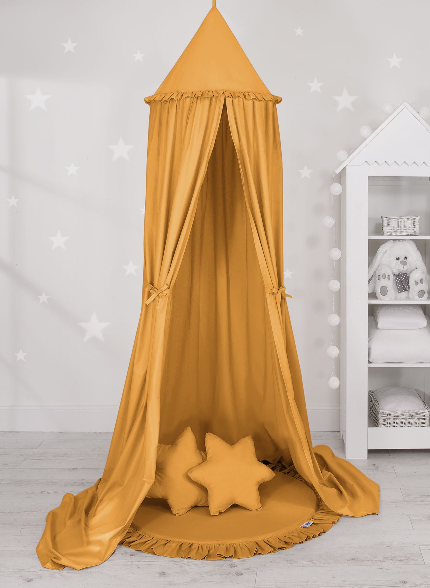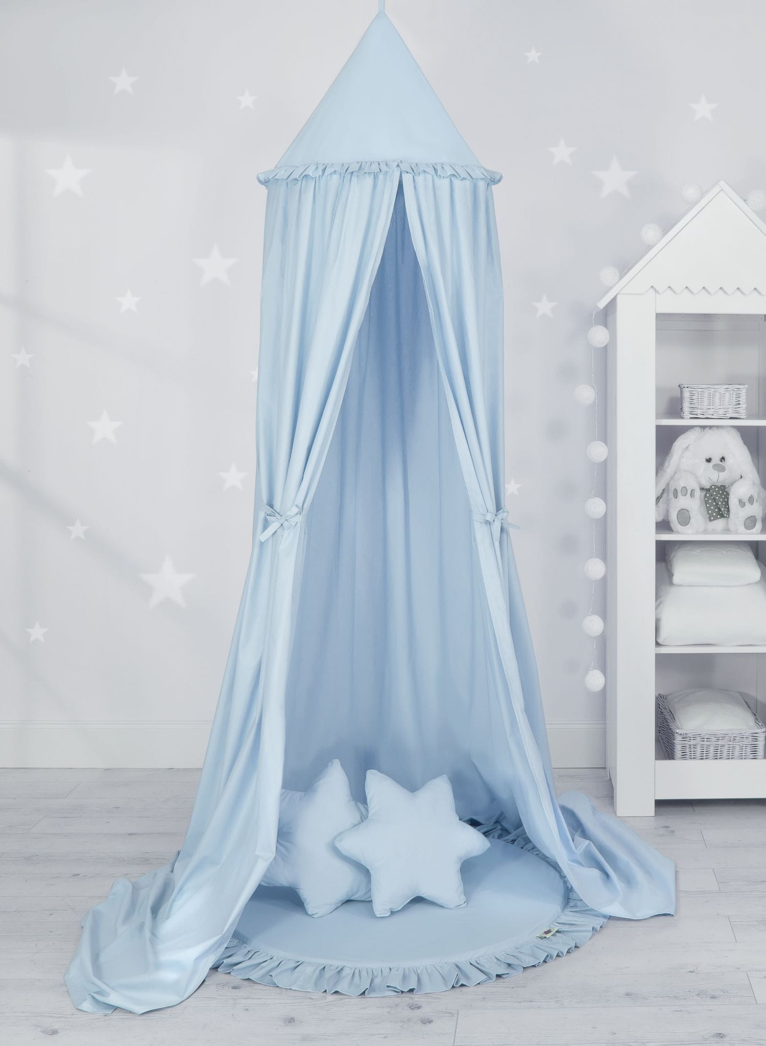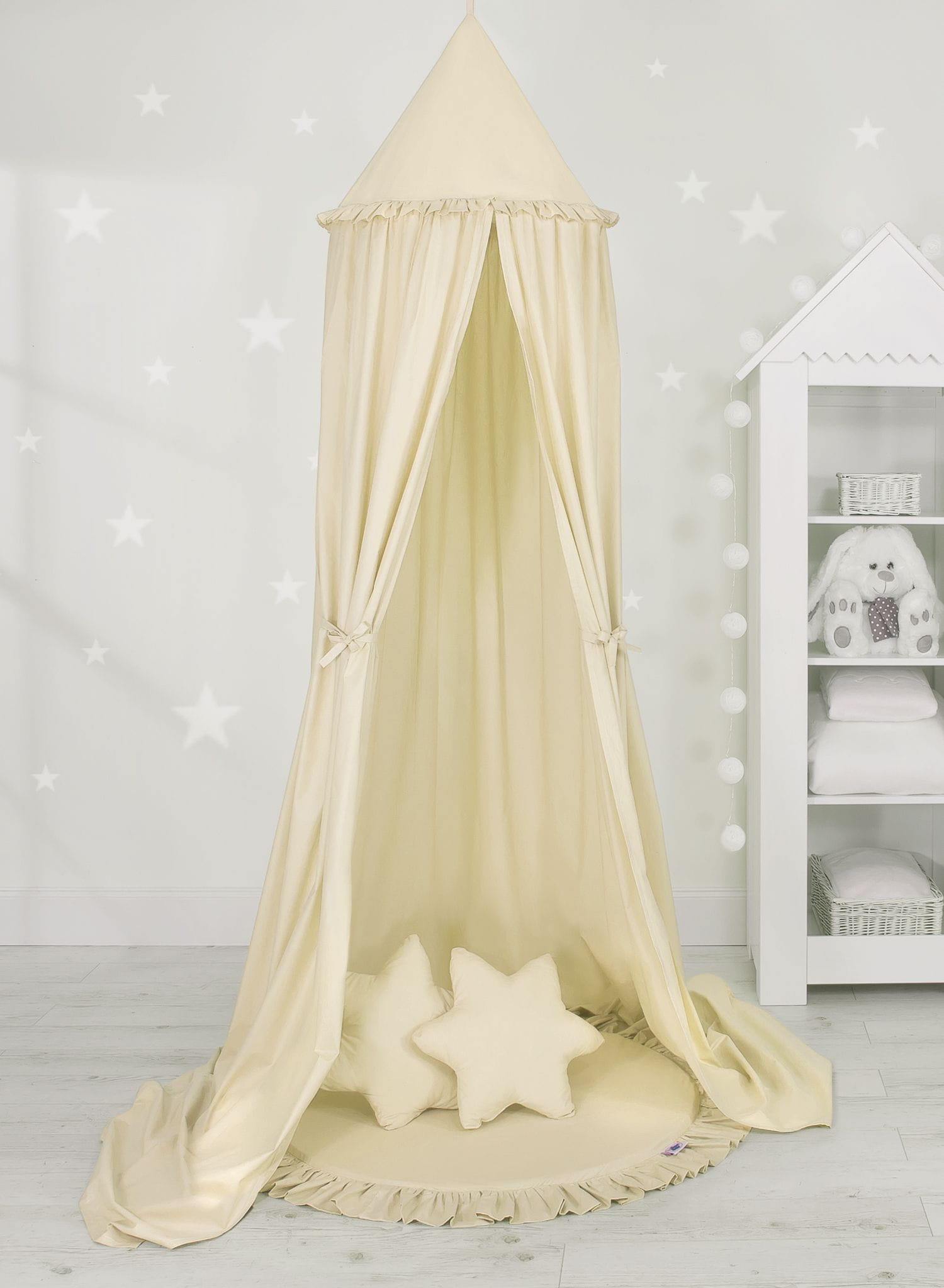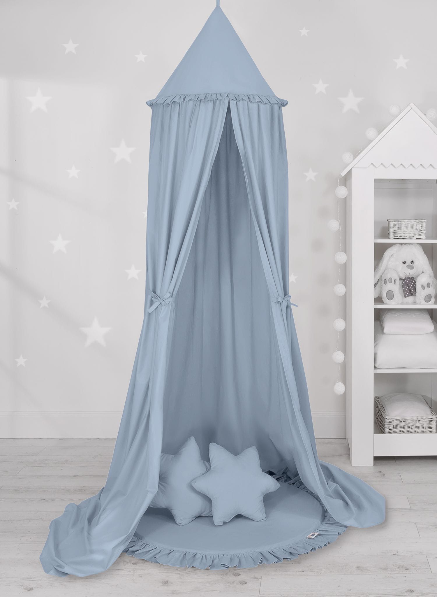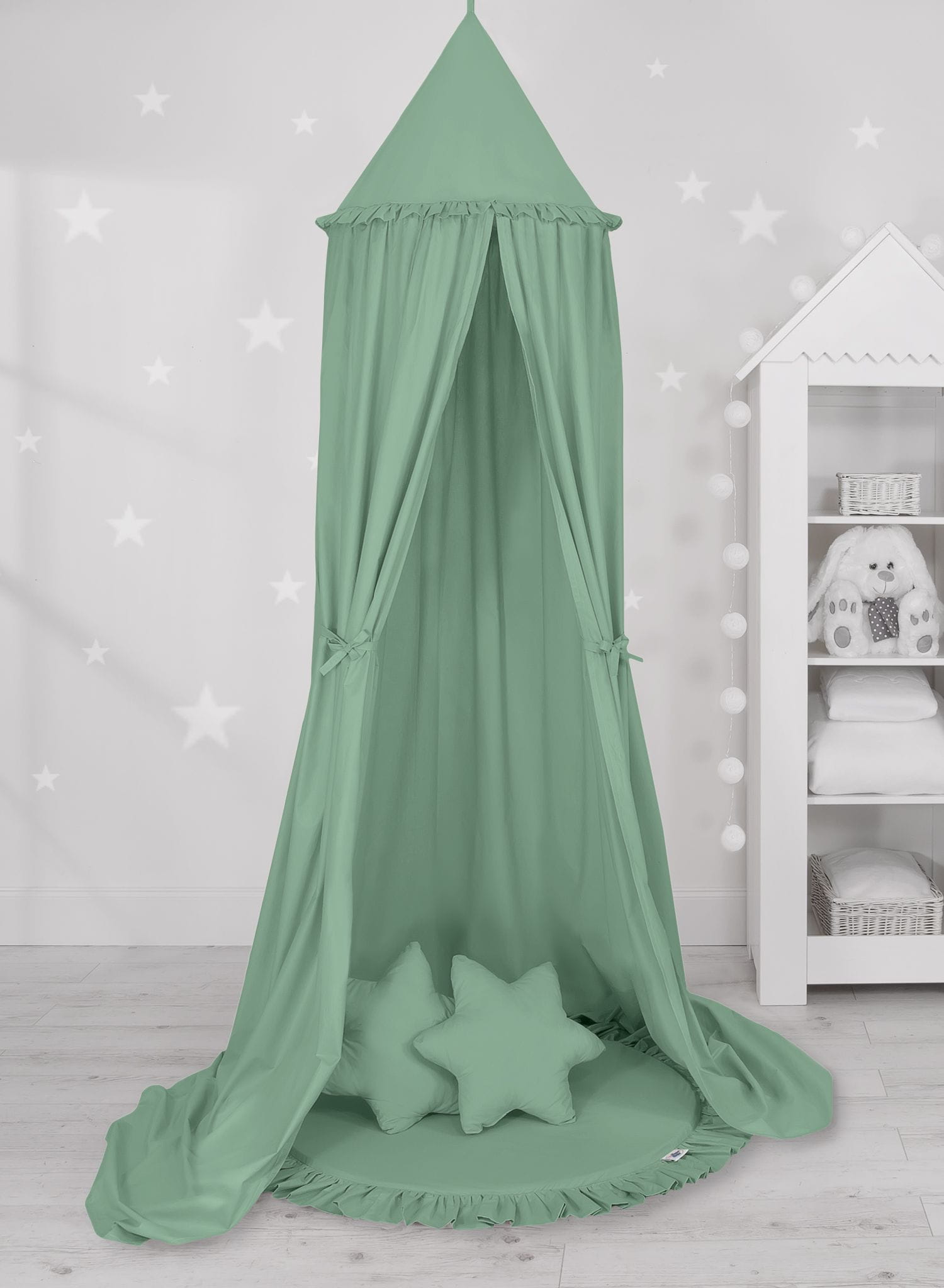 Stylowy zestaw do pokoju dziecięcego: baldachim wiszący, mata z falbanką i poduszki to idealne rozwiązanie do stworzenia przytulnej strefy zabawy i odpoczynku. Delikatny design, miękkie materiały i funkcjonalność, którą pokochają dzieci i mamy.