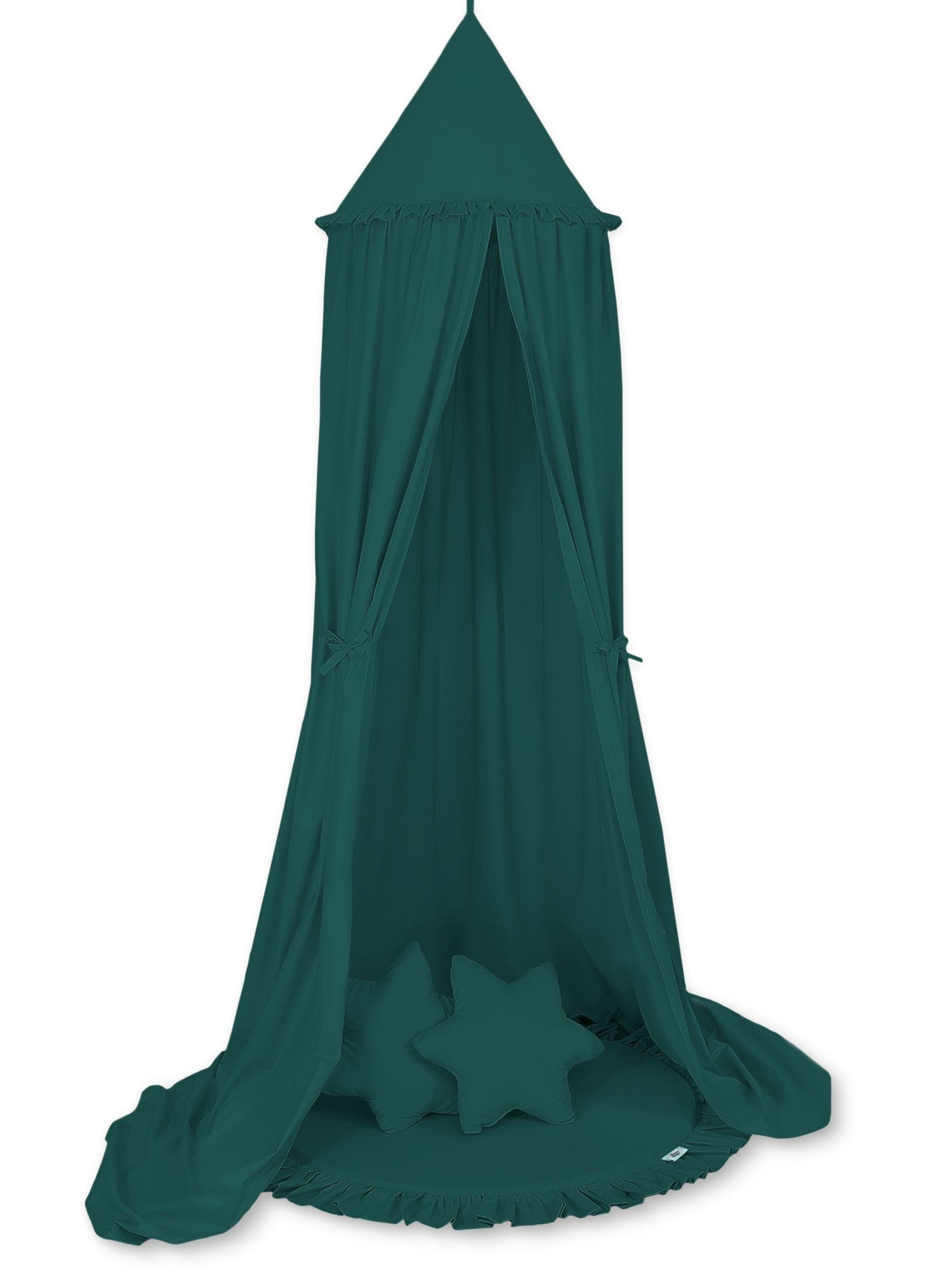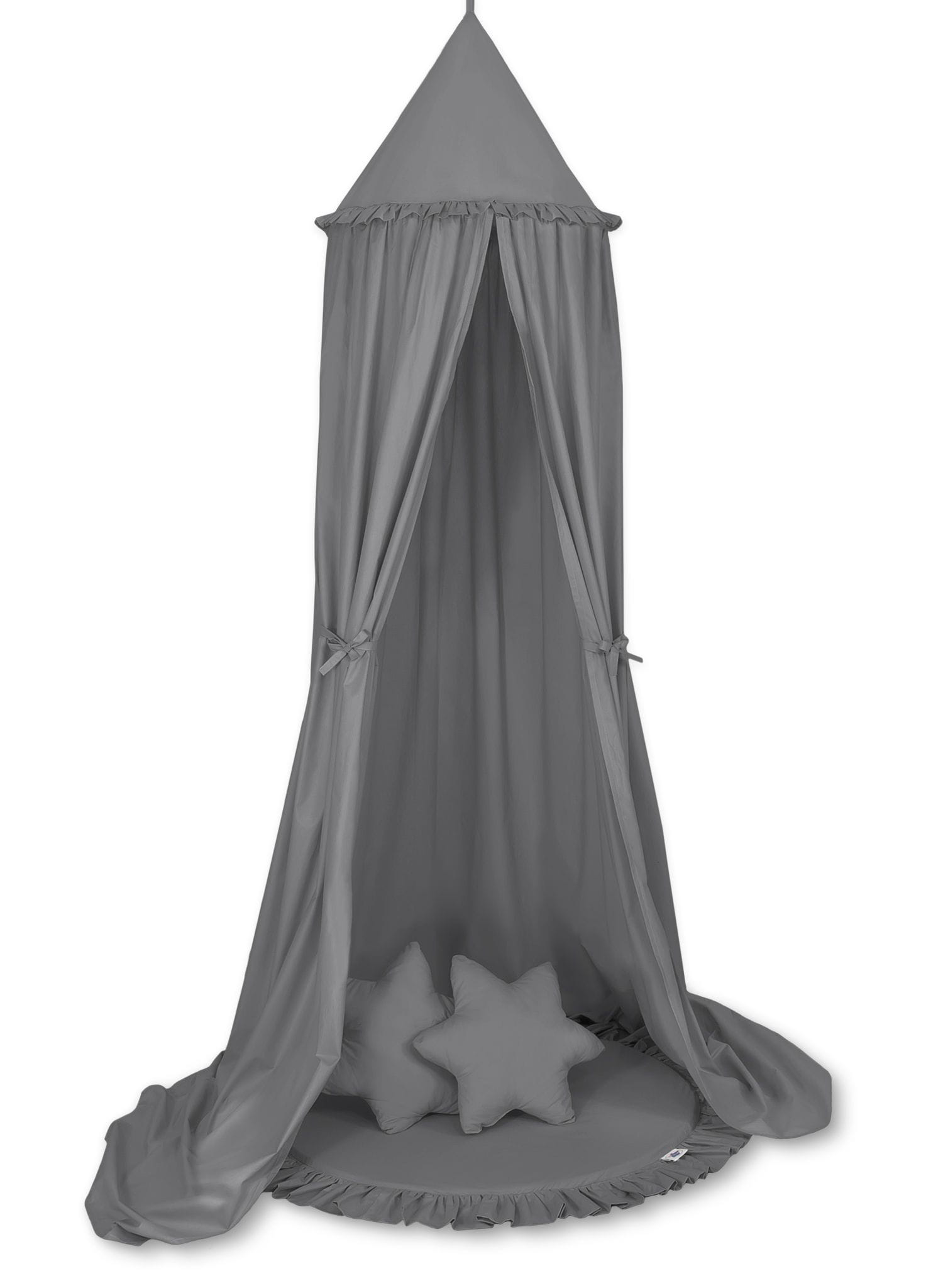 Baldachim wykonany jest z tkaniny 100% bawełnianej, posiadającej atest Okotex. Po bokach znajdują się praktyczne tasiemki, które umożliwiają dowolne upięcie baldachimu. Dzięki wyjmowanej obręczy z tworzywa sztucznego, łatwo utrzymać go w czystości - można prać w pralce.